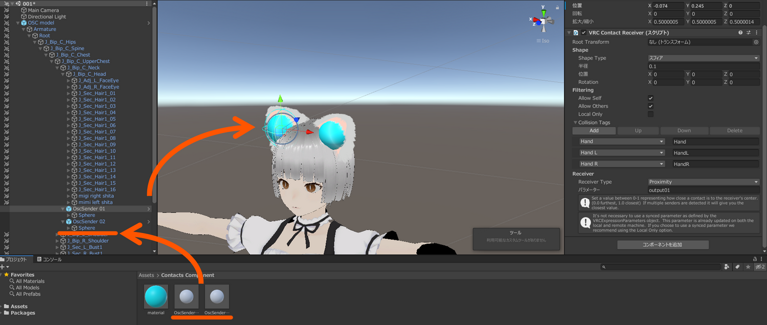 アバターの配下に接触判定となるVRC Contact Receiverコンポーネントを配置するだけ
